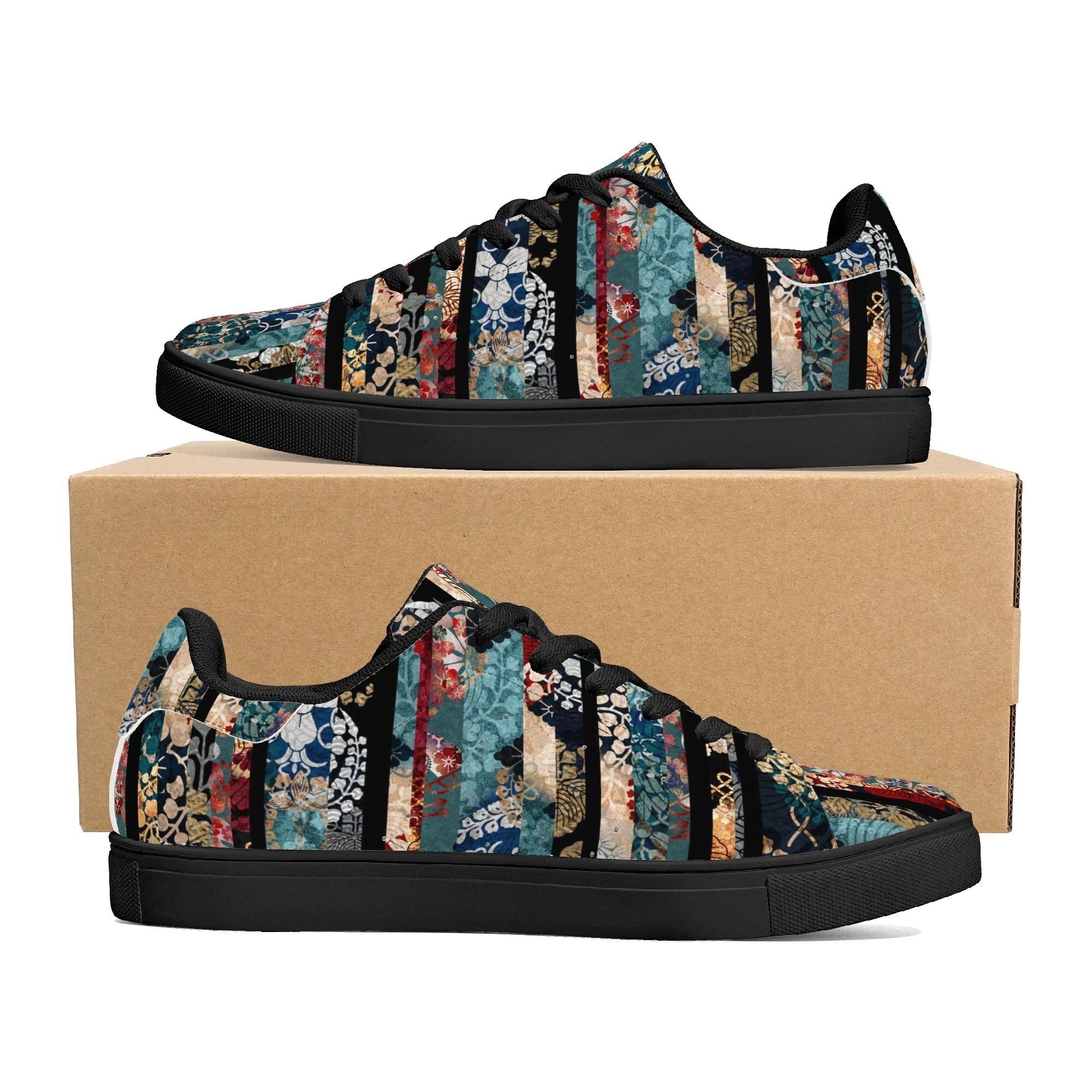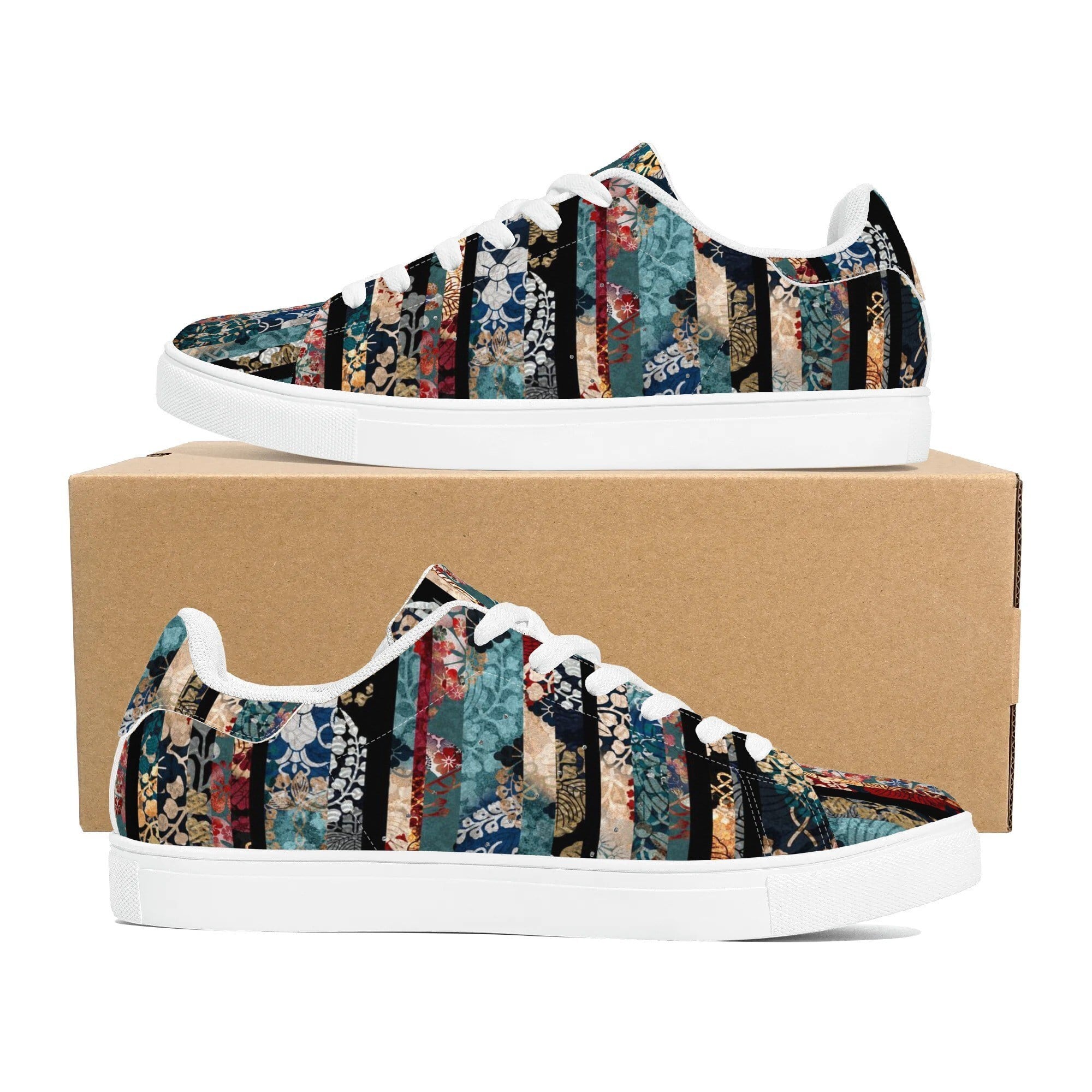 • 和紋様ストライプ ブルー 和柄 ヴィーガンレザー ロウトップスニーカー