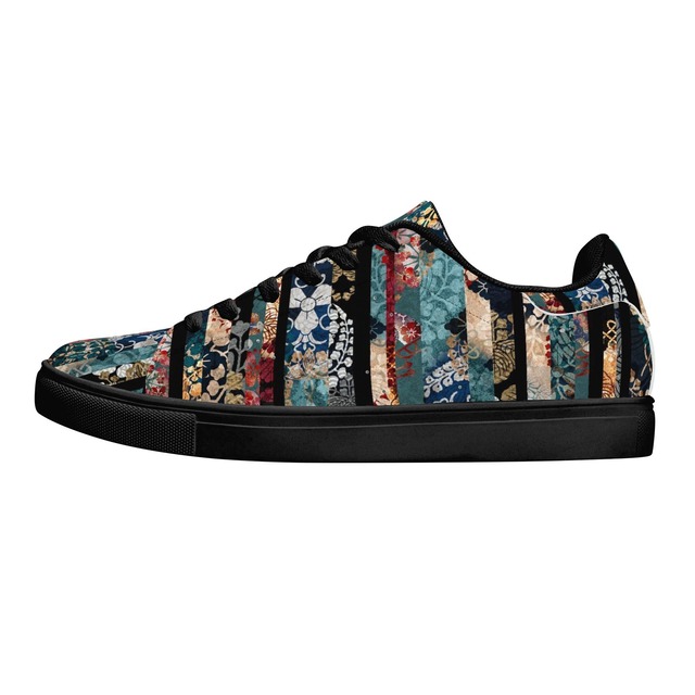 和紋様ストライプ ブルー 和柄 ヴィーガンレザー ロウトップスニーカー