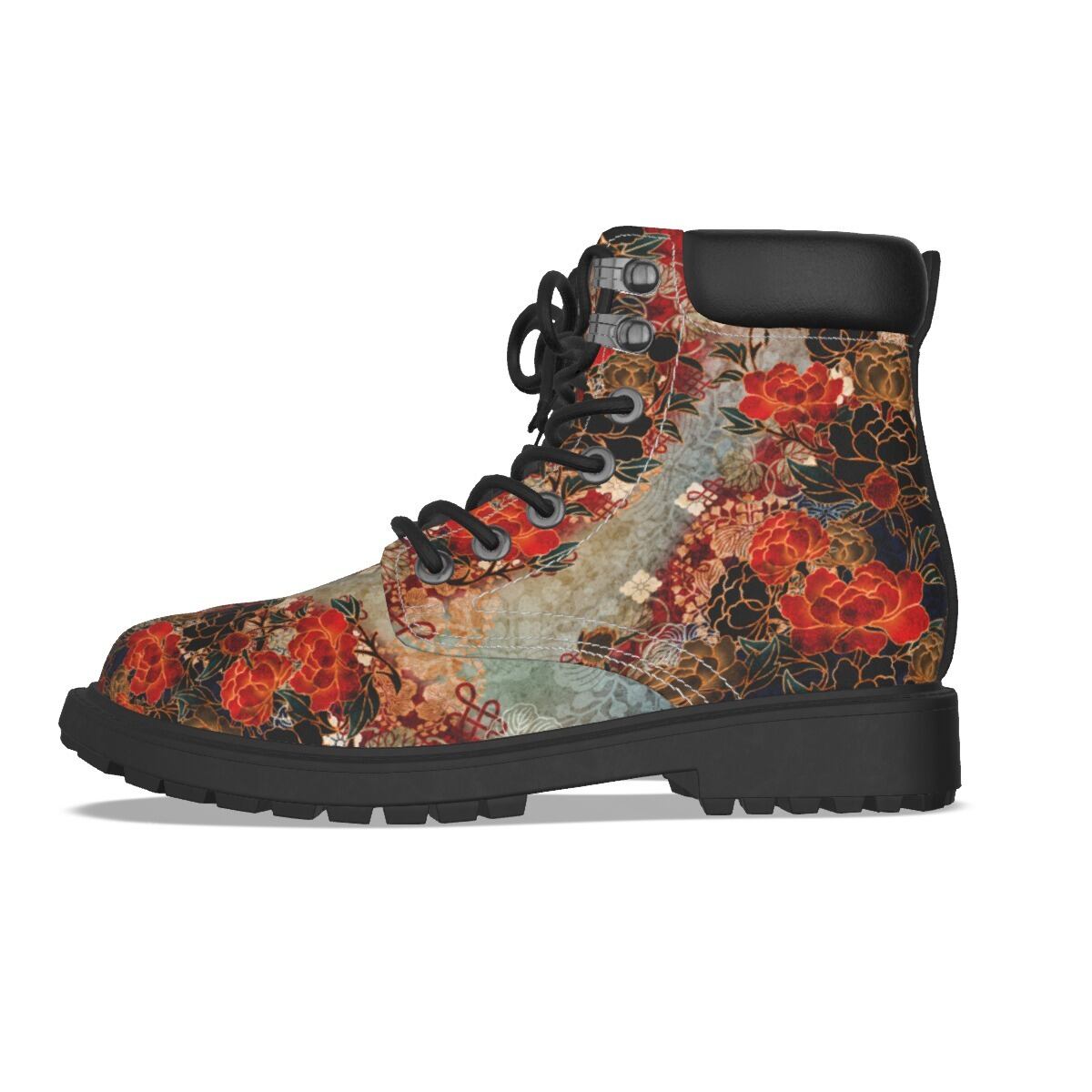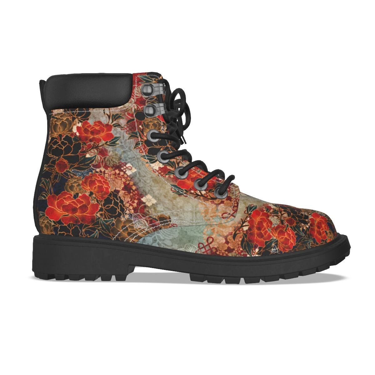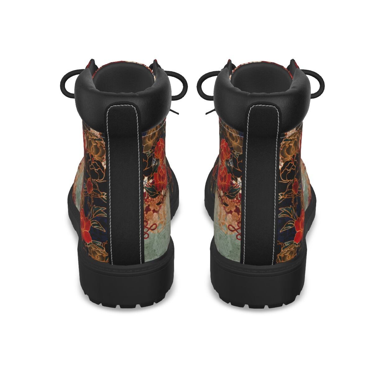 和牡丹紋様装飾 虹 和柄ユニセックスヴィーガンレザーブーツ