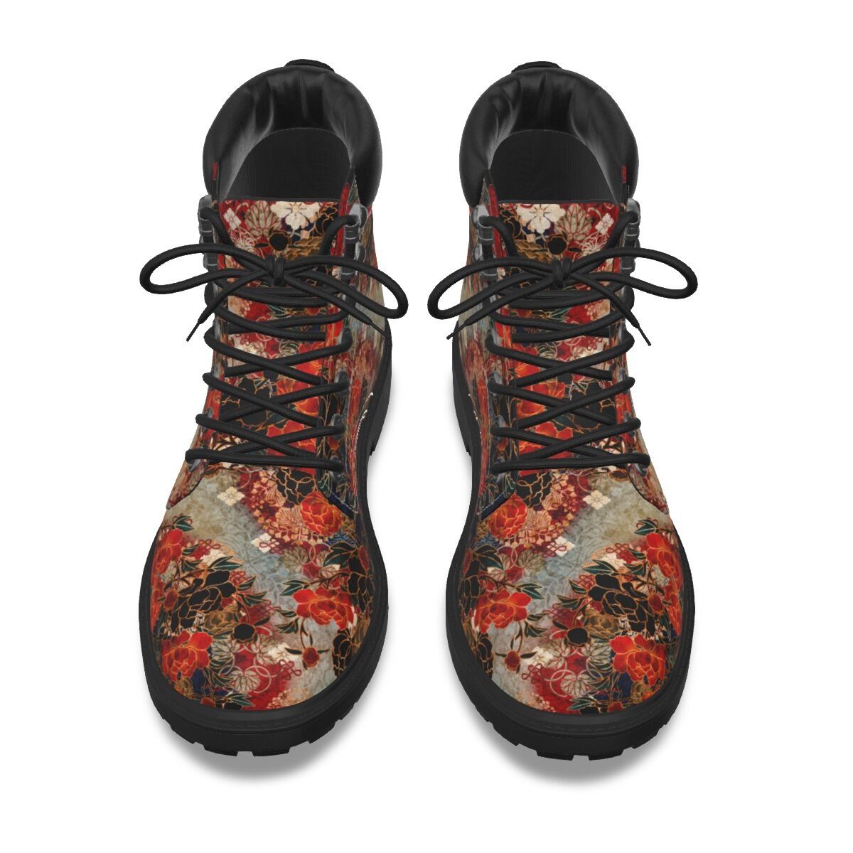 • 和牡丹紋様装飾 虹 和柄ユニセックスヴィーガンレザーブーツ