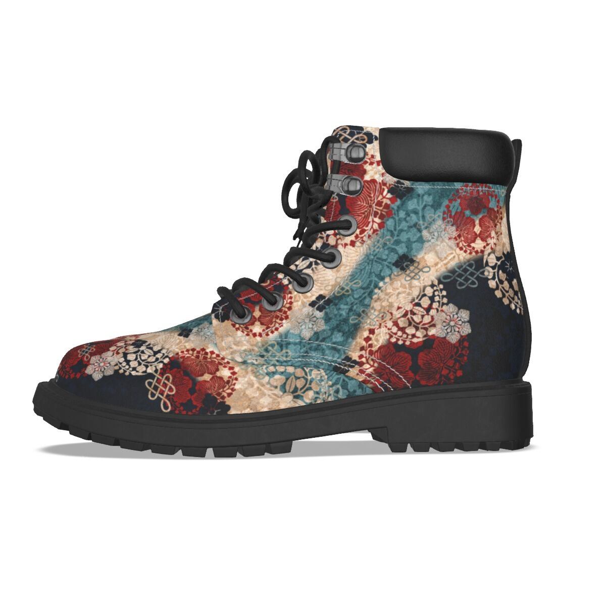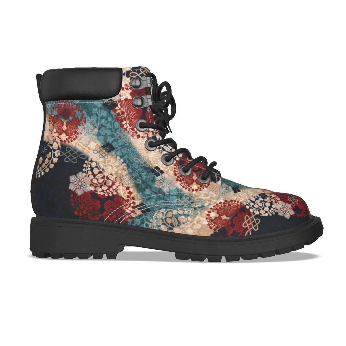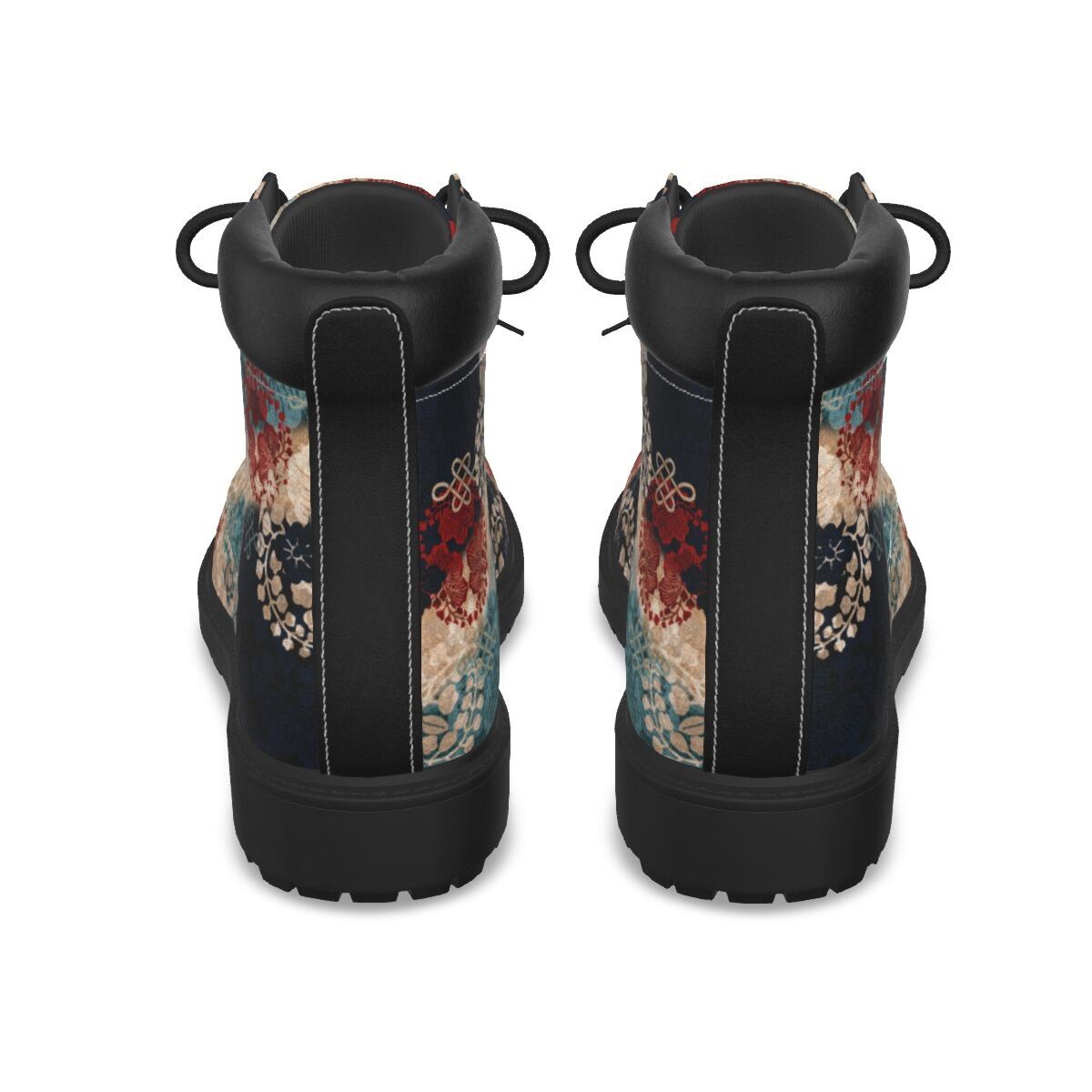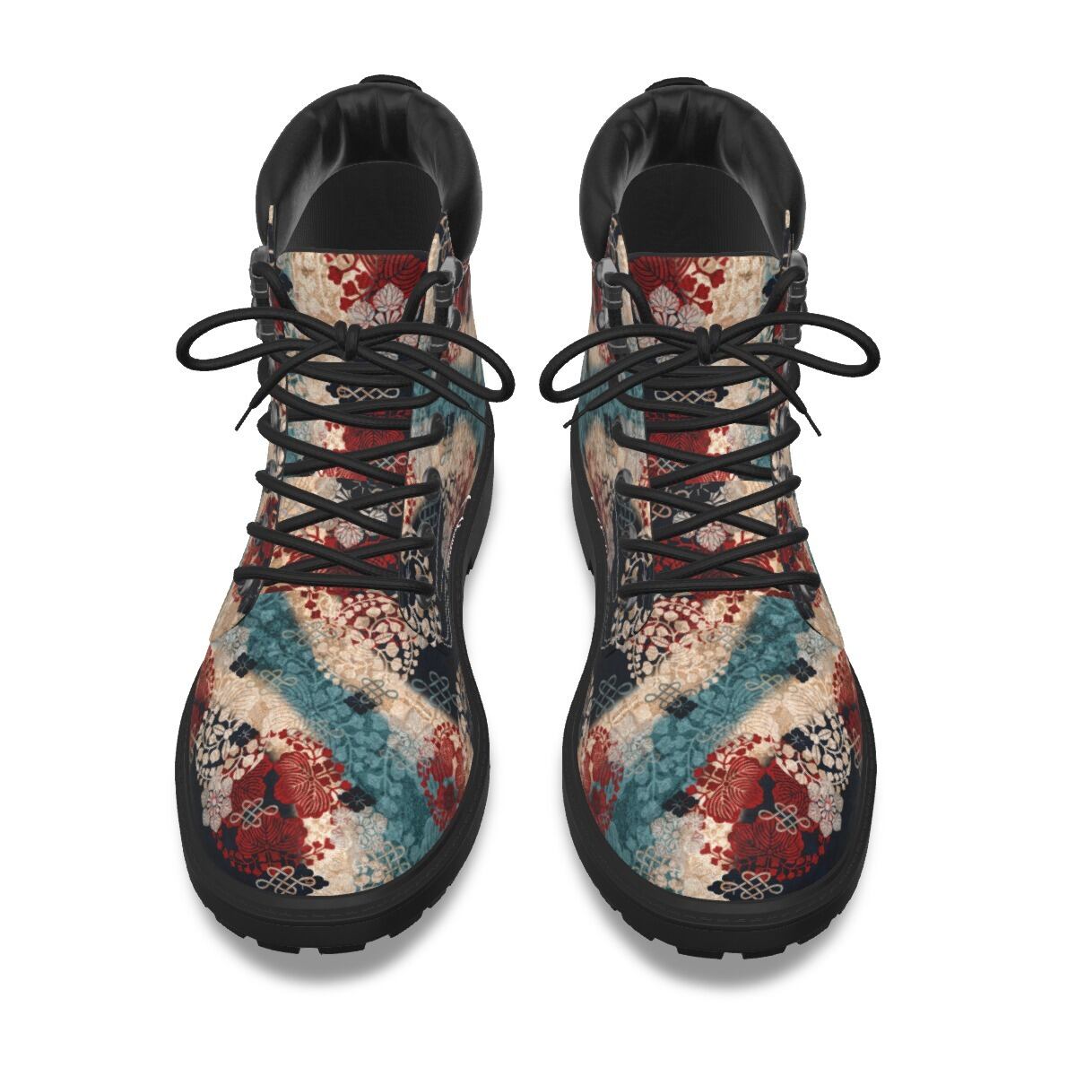 • 和紋様装飾 藍 和柄ユニセックスヴィーガンレザーブーツ