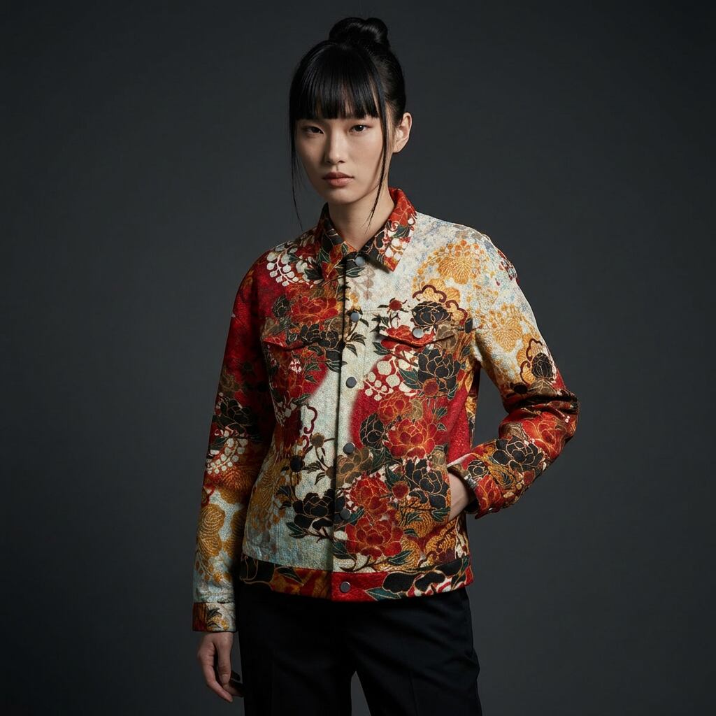 牡丹紋様 紅白 和柄 コットンデニム風ジャケット