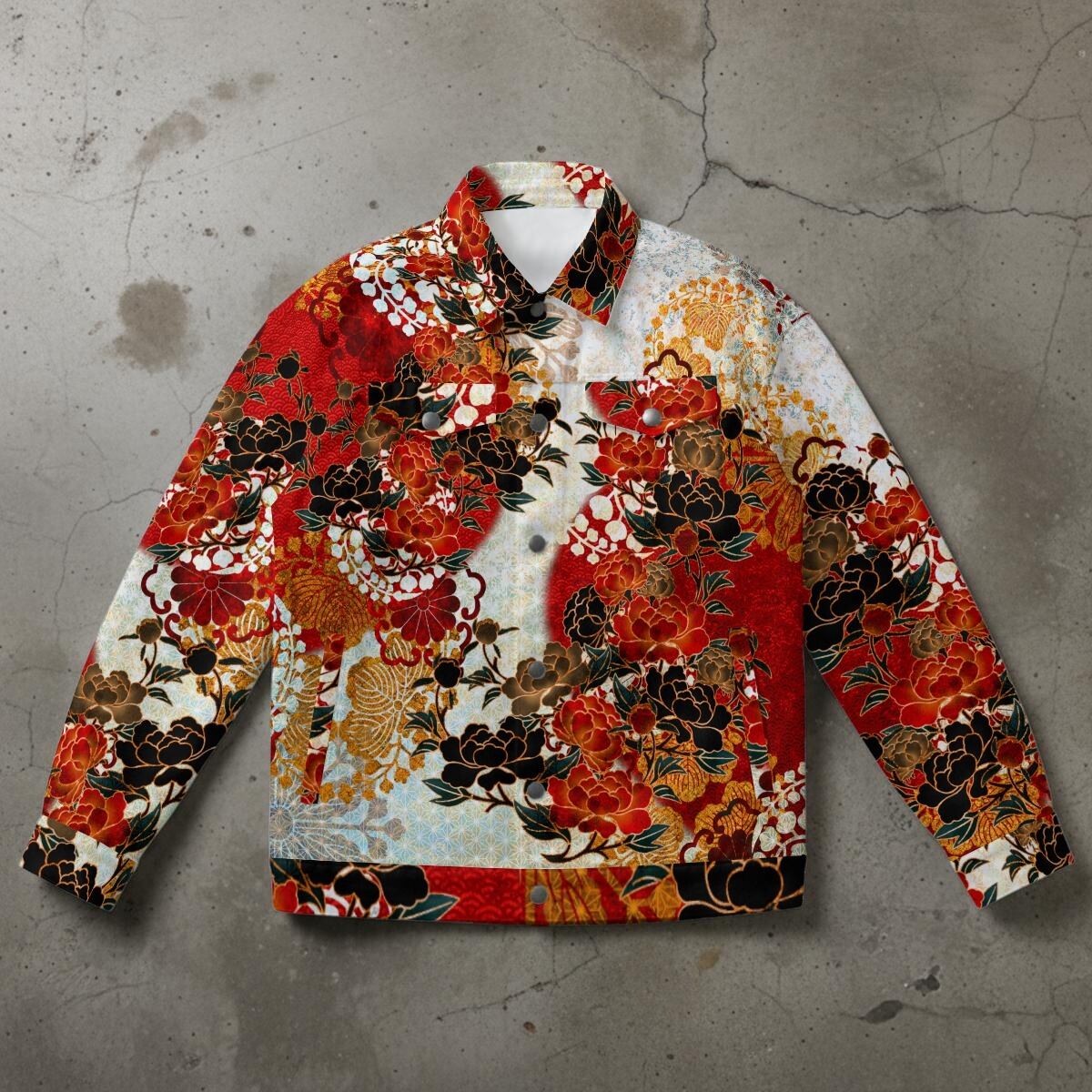 • 牡丹紋様 紅白 和柄 コットンデニム風ジャケット