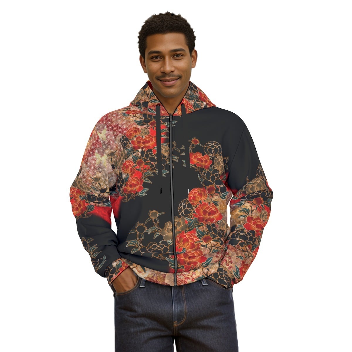 牡丹紋様 黒 ユニセックスジップアップパーカー 裏地付